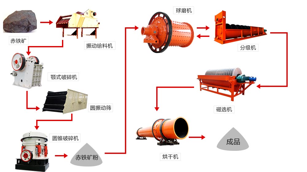 首先磁鐵礦由振動(dòng)給料機(jī)均勻的送到顎式破碎機(jī)進(jìn)行初破,初破后的磁鐵由皮帶輸送機(jī)進(jìn)行二破,二破后的磁鐵由圓振篩進(jìn)行篩選,不合格返回圓錐破碎機(jī)繼續(xù)破碎,合格的被送到球磨機(jī)進(jìn)行研磨,研磨后的磁鐵礦粉磨被送到分級(jí)機(jī)進(jìn)行分選,不合格的被返回繼續(xù)研磨,合格的被送到磁選機(jī)進(jìn)行磁選,磁選后的物料經(jīng)脫水干燥后近視我們所要的產(chǎn)品。