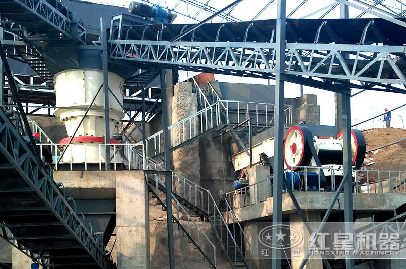a、配置為:顎式破碎機(jī)+圓錐式破碎機(jī)的大型石頭碎石現(xiàn)場(chǎng)